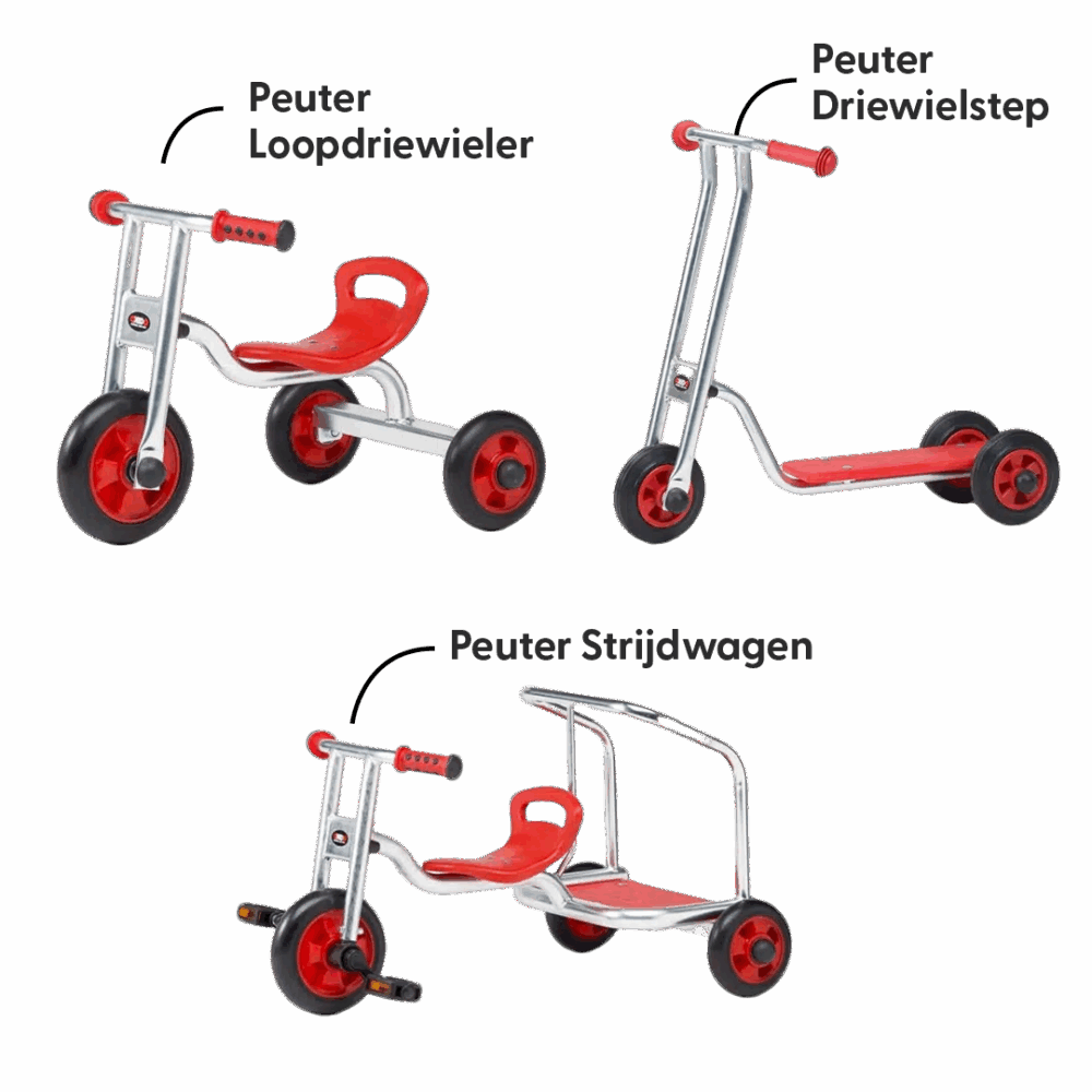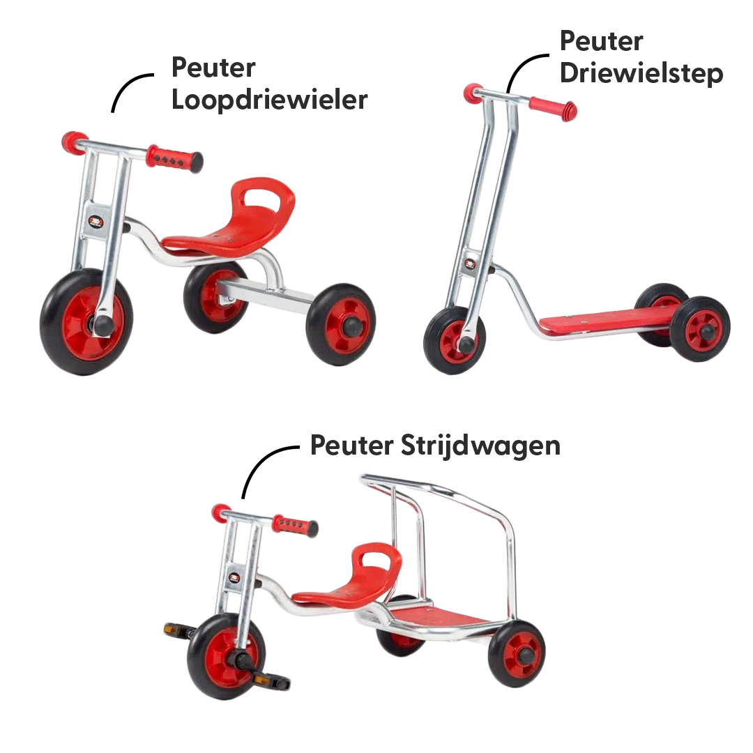 Met het peuterpakket geef je peuters de perfecte start om de wereld spelenderwijs te ontdekken. Dit complete pakket bestaat uit een driewieler midi, tandem midi en een peuter driewielstep. Dit maakt het pakket ideaal om samen te spelen, balans te oefenen en eindeloos plezier te beleven!